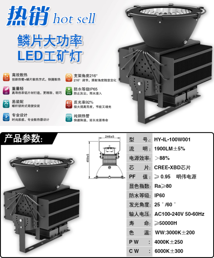 深圳工矿灯工厂100W工矿灯明纬电源科瑞灯珠工矿灯质保5年LED鳍片工矿灯