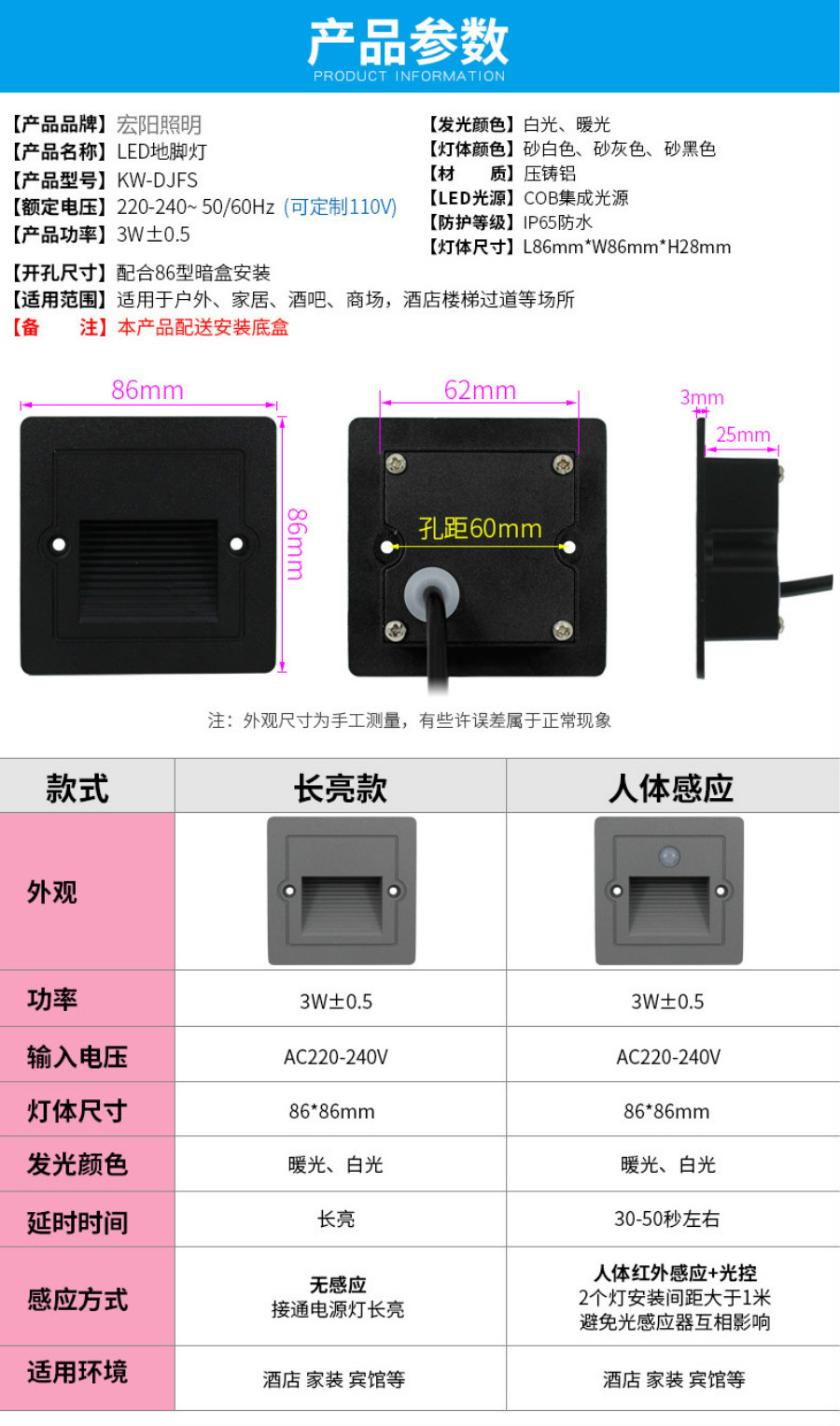 3Wled地脚灯86型户外防水人体感应地脚灯过道楼梯小夜灯别墅户外防水地脚灯
