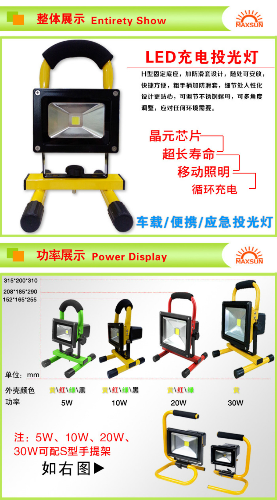 LED充电投光灯产品介绍: 光源:集成30W 材质:压铸铝 颜色:正白/暖白 外壳颜色:红色/黄色/绿色/黑色/蓝色